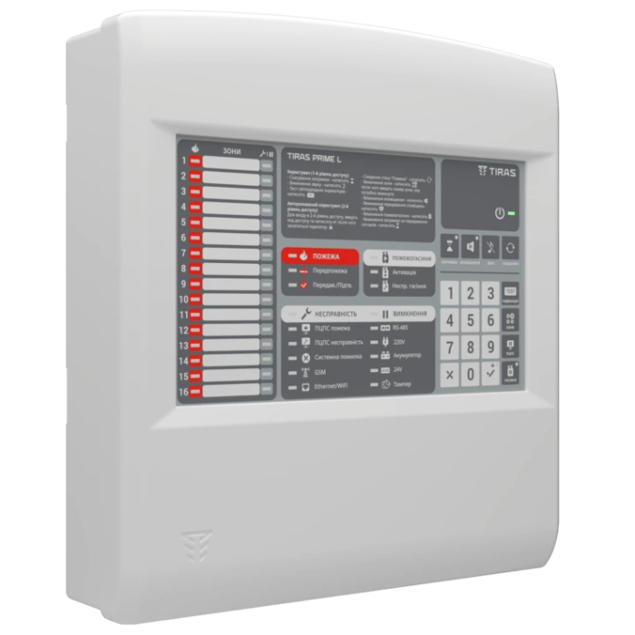 ● Базові зони: 16;● Сповіщувачів в зоні: 32;● Напруга в зоні: 24 В;● Виходи:  "Пожежа", "Несправність", 2 релейні виходи для оповіщення чи контролю автоматики;● Інтрефейси: 2x  RS-485 (довжина шини до 1000 м), USB-C, Ethernet;● Розширення (через RS-485):  до 16 пристроїв загалом, до 8 M-OUT8R або M-OUT2R box, до 8 ПУІЗ Tiras 1X;● Основне живлення: 220 В;● Резервне живлення: АКБ 2x 7-8 А•год;● 280х280х80 мм